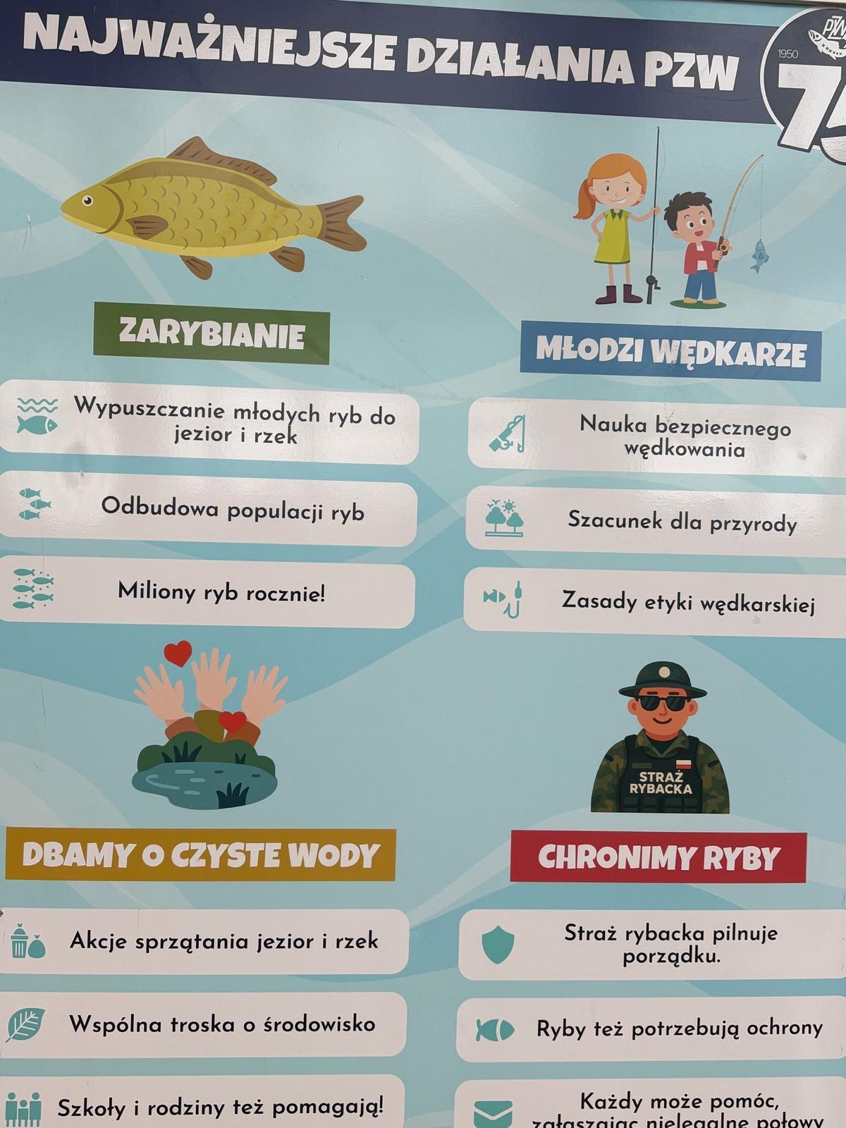 Kolejna strefa – „Kolorowy świat ryb” – miała charakter plastyczno-edukacyjny i obejmowała kolorowanki, quizy. Natomiast w strefie „Partnerstwo dla przyrody” uczniowie poznali zasady odpowiedzialnego wędkarstwa oraz działalność Polskiego Związku Wędkarskiego.