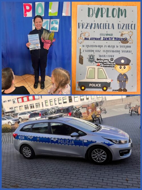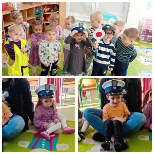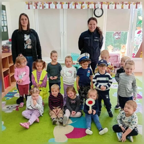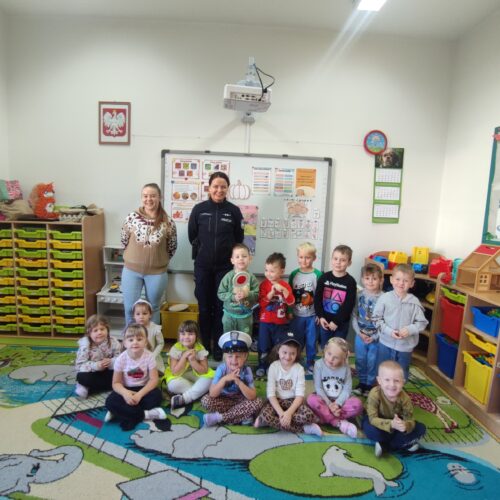 Na koniec spotkania dzieci miały niespodziankę – usłyszały dźwięk syreny wozu policyjnego, co wywołało ogromne emocje i radość! Dzieci były zachwycone i z pewnością zapamiętają tę wizytę jako cenne doświadczenie, które pomoże im lepiej zrozumieć, jak dbać o swoje bezpieczeństwo.