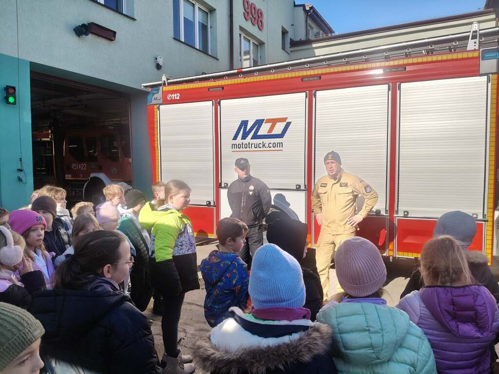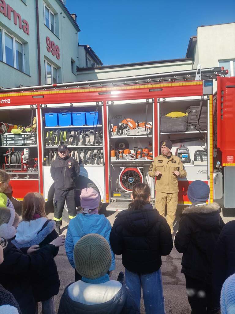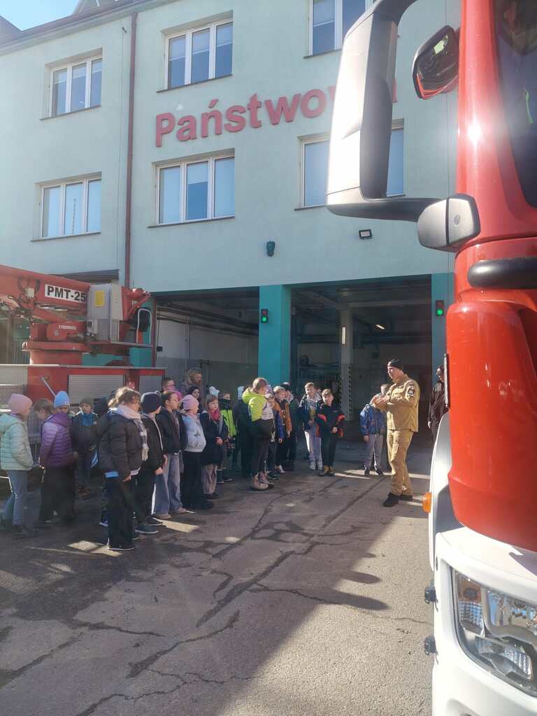 Po spektaklu uczniowie klas pierwszych udali się z powrotem do szkoły, natomiast drugoklasiści wybrali się na zajęcia edukacyjne do Państwowej Straży Pożarnej. Dzieci miały okazję zobaczyć z bliska wóz strażacki oraz specjalistyczny sprzęt ratowniczy. Dowiedziały się, jak wygląda codzienna praca strażaków i jak należy zachować się w sytuacjach zagrożenia. Nasze zajęcia przerwał nieoczekiwany alarm. W jednej chwili strażacy musieli przerwać spotkanie i natychmiast udać się na akcję ratunkową.