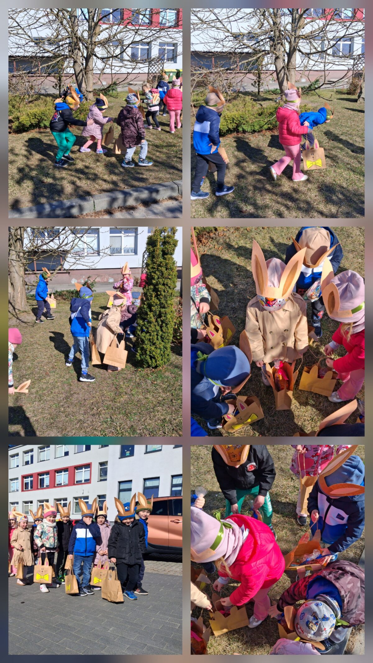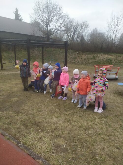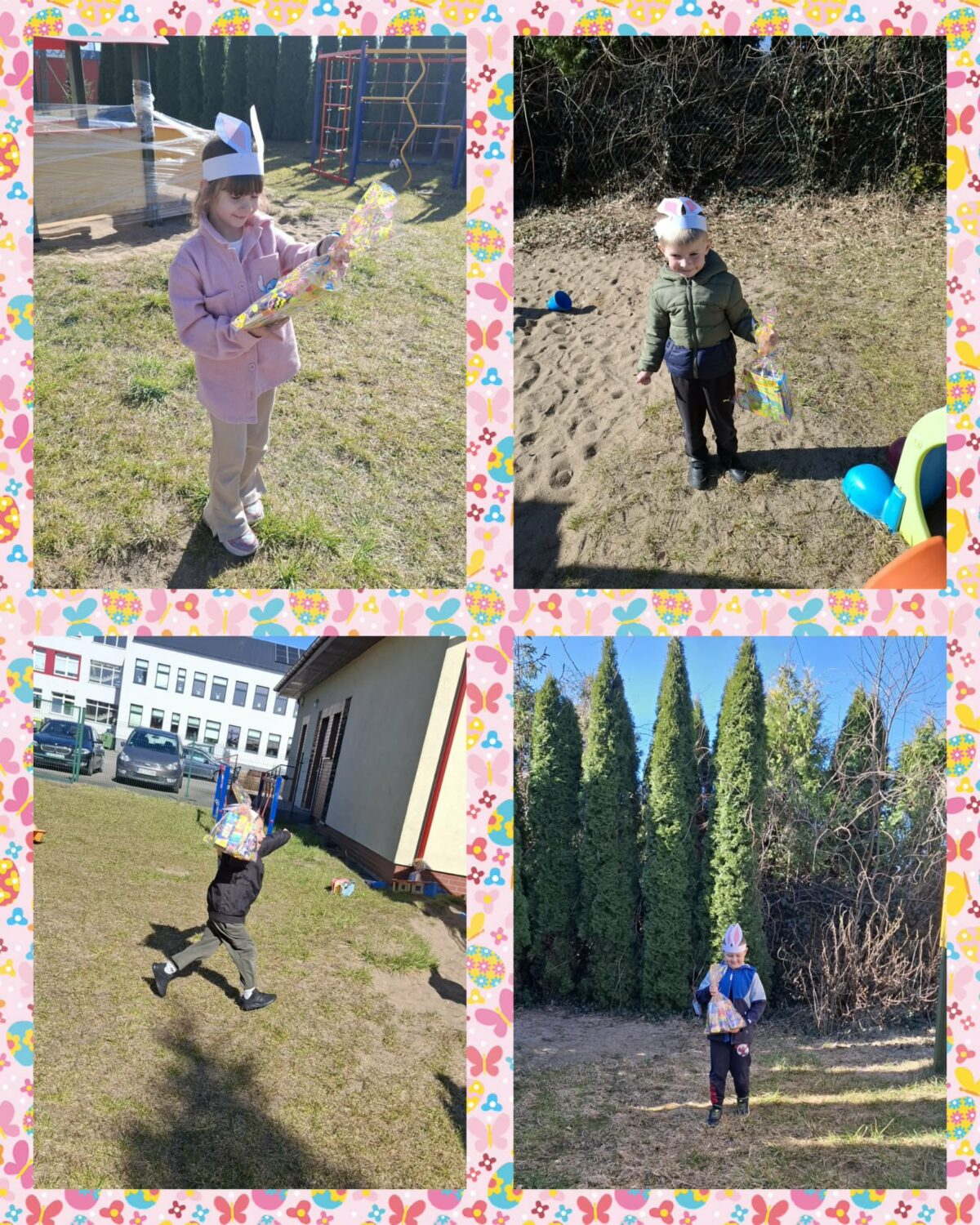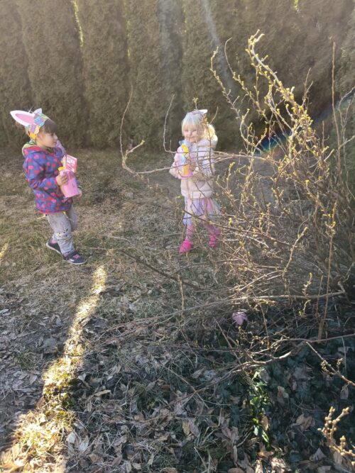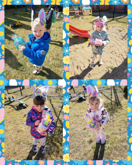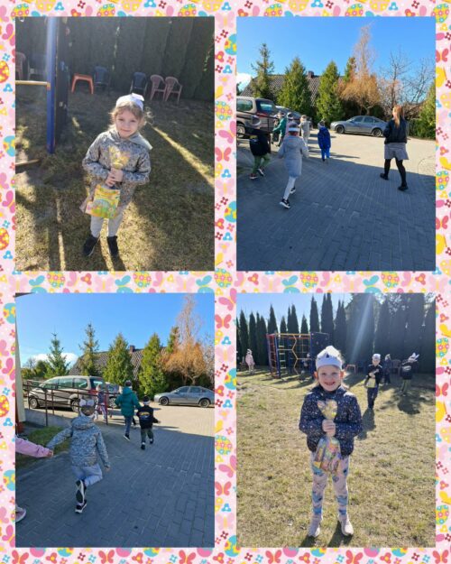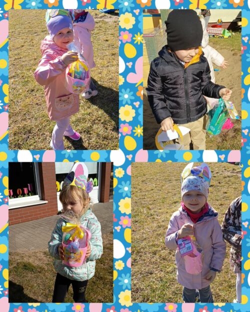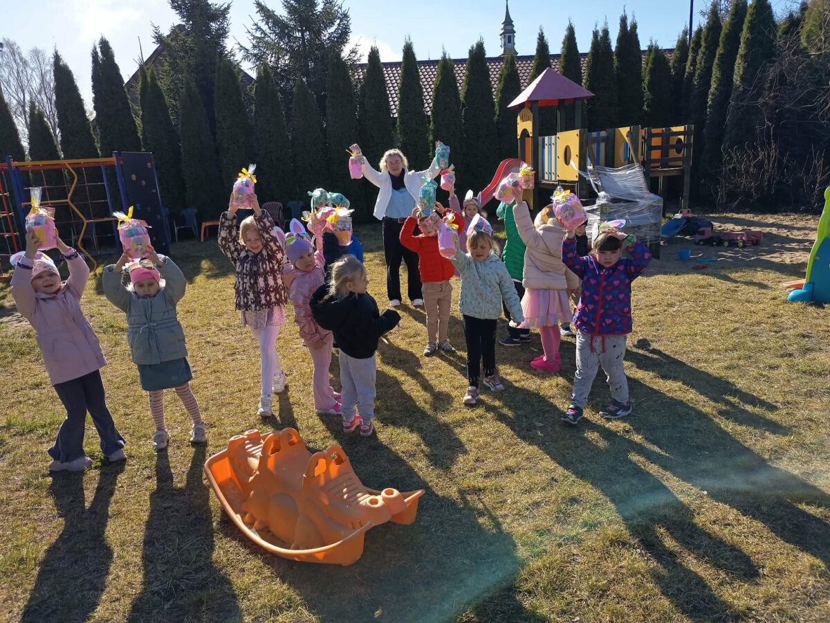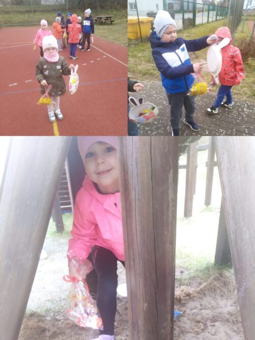 Po wykonaniu wszystkich zadań przyszedł czas na najważniejszy moment – poszukiwanie prezentów! Dzieci wyruszyły na przedszkolny ogród, gdzie z radością i ekscytacją szukały ukrytych niespodzianek od zajączka. Uśmiechom i śmiechom nie było końca, gdy każde dziecko znalazło swój upominek.