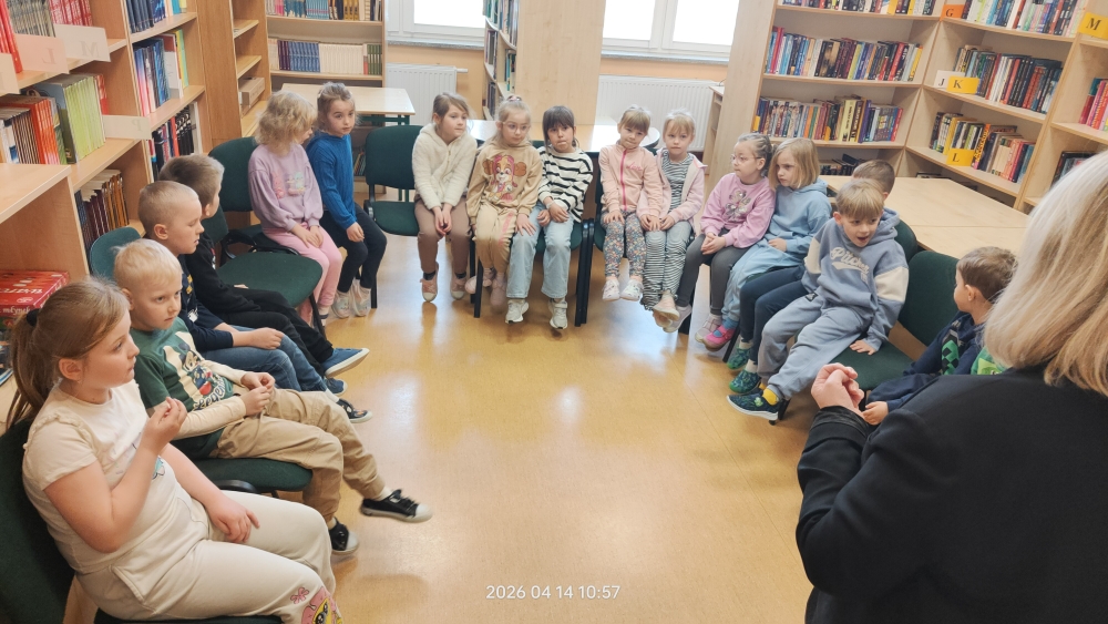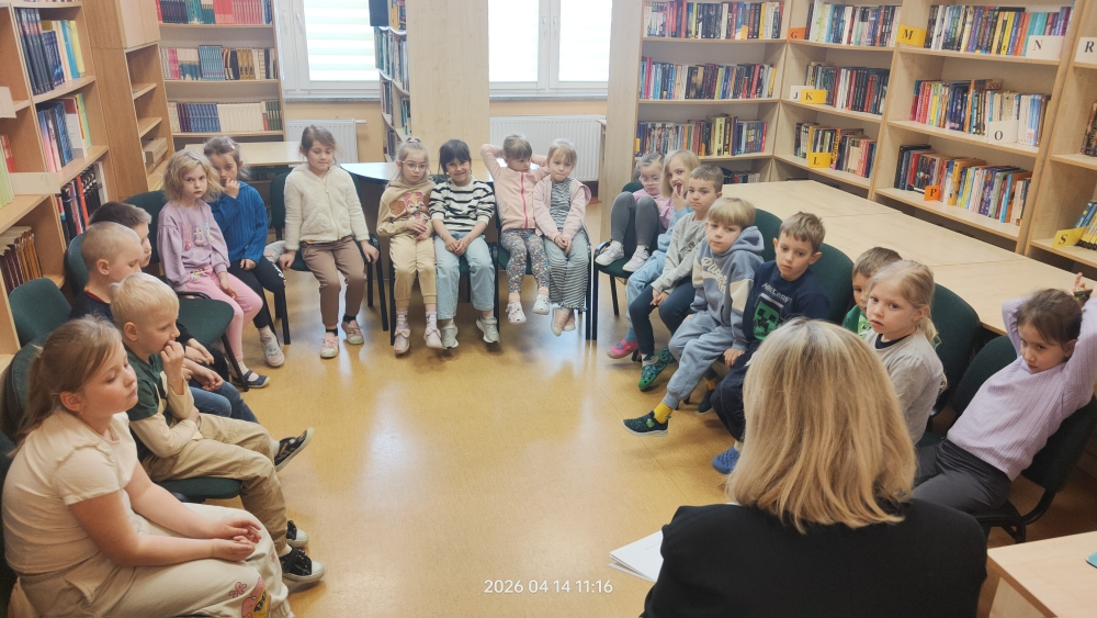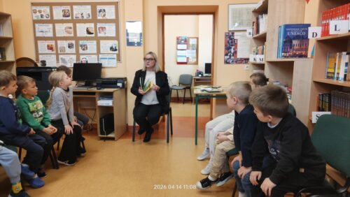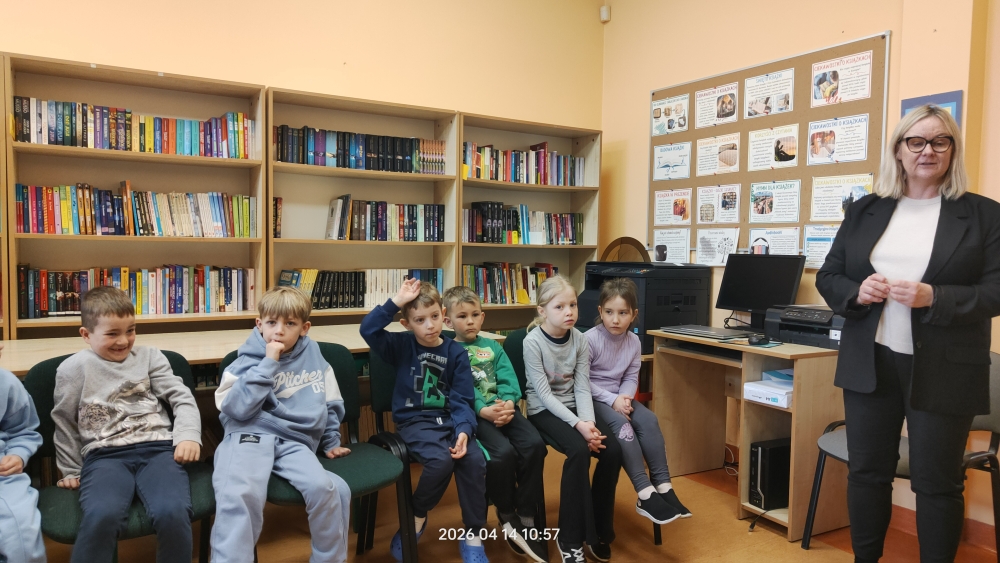 W dniu 14. kwietnia w ramach realizacji działań edukacyjnych dzieci uczestniczyły w wizycie w bibliotece szkolnej. Spotkanie poprowadziła Pani Aneta, która w interesujący i przystępny sposób przybliżyła uczniom specyfikę pracy bibliotekarza. Przedstawiła zasady obowiązujące w bibliotece oraz omówiła procedurę wypożyczania książek. Dzieci dowiedziały się również, że od klasy pierwszej będą mogły korzystać z zasobów biblioteki jako jej pełnoprawni czytelnicy.