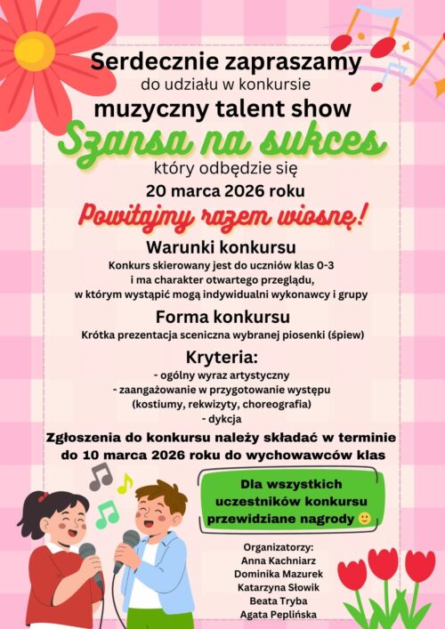 Zaproszenie do udziału w konkursie „Muzyczny Talent Show – Szansa na Sukces” 22 lutego 2026, 19:42 Dominika Mazurek Kategorie wpisu AktualnościSzkoła podstawowa