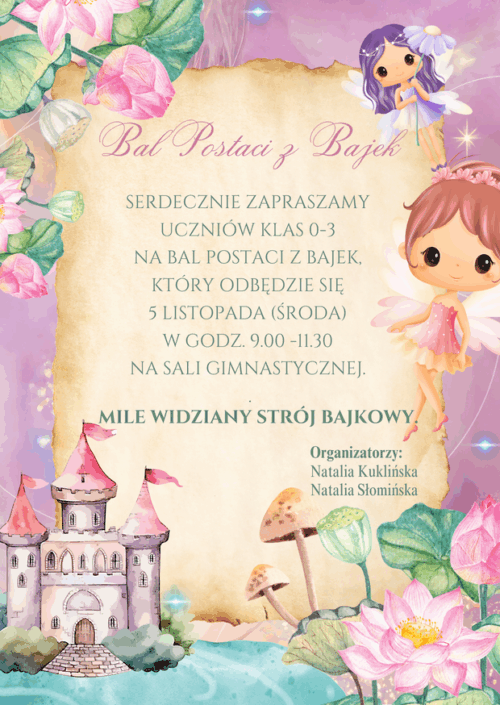 Zaproszenie na Bal Postaci z Bajek 31 października 2025, 19:03 Elżbieta Turzyńska Kategorie wpisu AktualnościSzkoła podstawowa