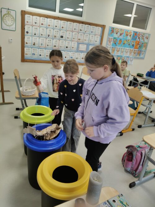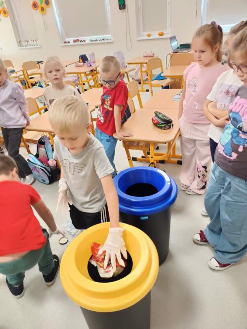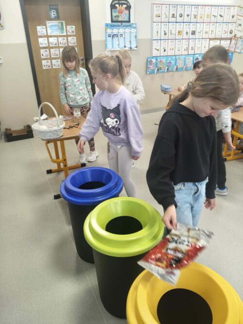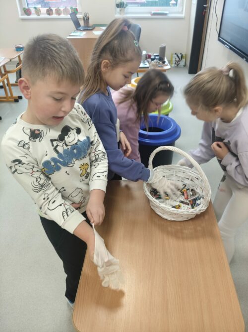 W trakcie zajęć uczniowie wzięli udział w zabawie dydaktycznej Bateria – skarb czy kłopot?, w której mieli za zadanie odróżniać przedmioty nadające się do zwykłego kosza od tych, które należy oddać do specjalnych pojemników. Dodatkowo rozwiązywali krótkie zagadki o bateriach, kolorowali ilustracje z motywem recyklingu: