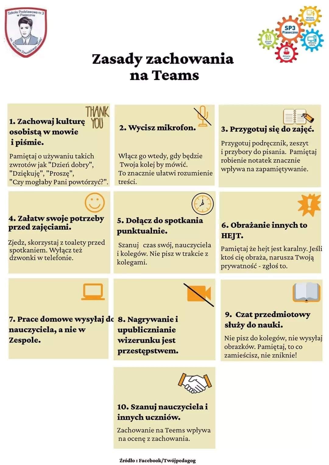 - Zasady zachowania na MS Teams znajdziesz na szkolnej stronie internetowej. Koniecznie się z nimi zapoznaj i przestrzegaj ich.